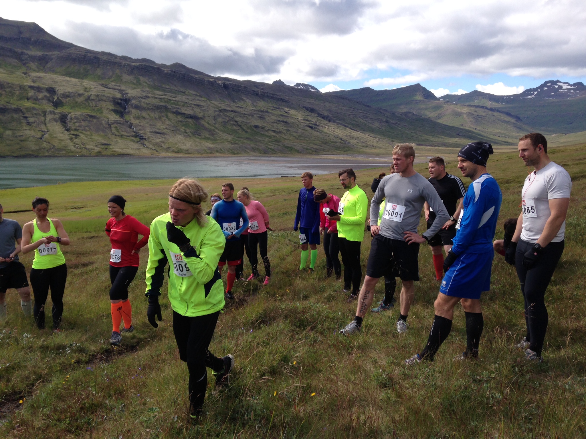 Hlaupið hófst svo í túnfætinum klukkan tíu. Hópurinn hentist af stað gegnum döggvott grasið, sem náði manni í hné, og upp á gamlan vegaslóða sem liggur með nesinu í Viðfjörð. Á leiðinni urðum við að stikla yfir smá læki og sullast yfir mýrarfláka og þegar í Viðfjörðinn kom vorum við orðnir svo blautir að við óðum bara yfir ána í stað þess að fara yfir brúna. Þá vorum við komnir í fyrstu drykkjarstöðina. Liðið var fjörugt, en stóð ekki lengi við eftir þambið heldur stökk af stað, endurnært eftir vatnssopann.